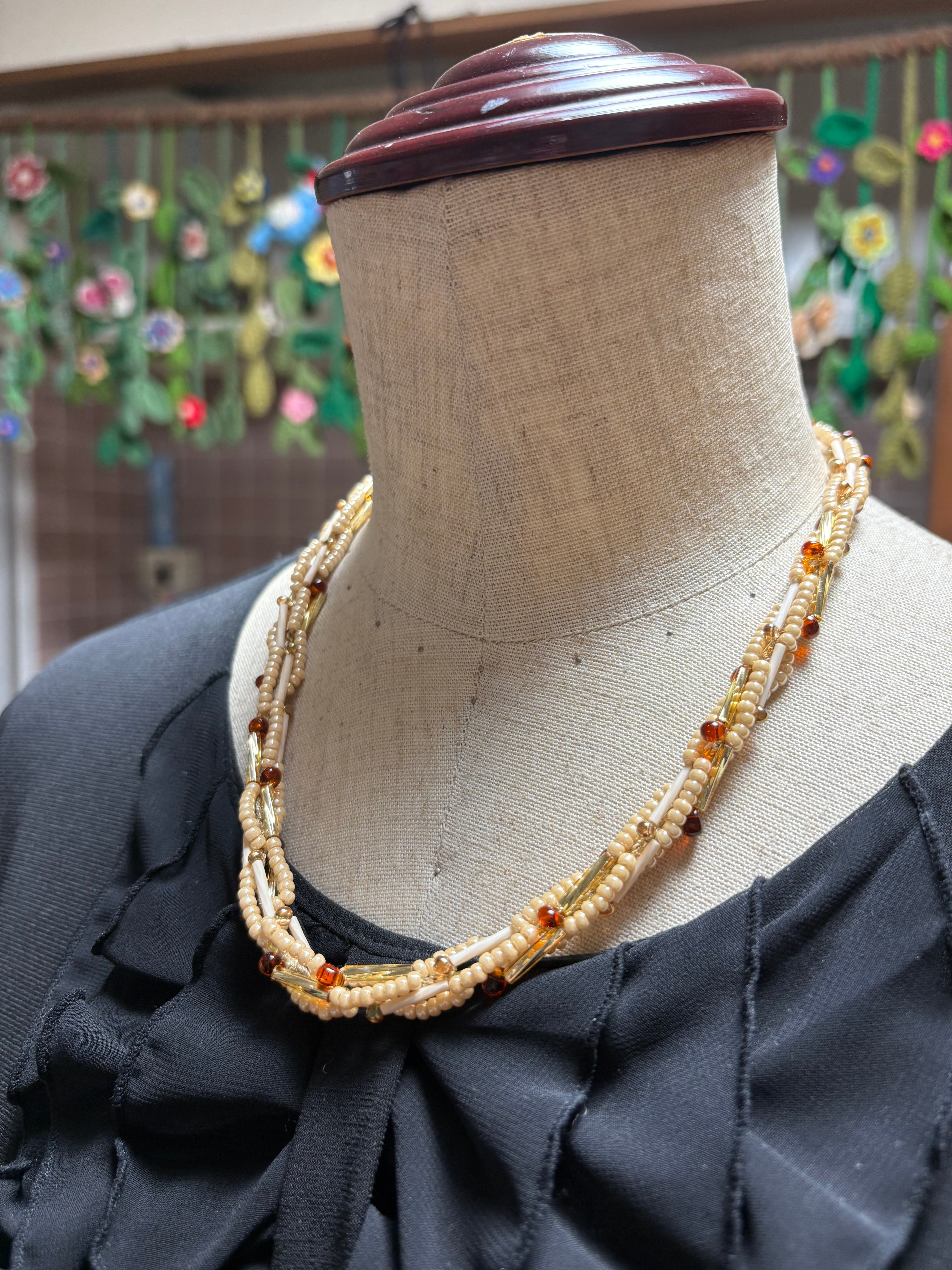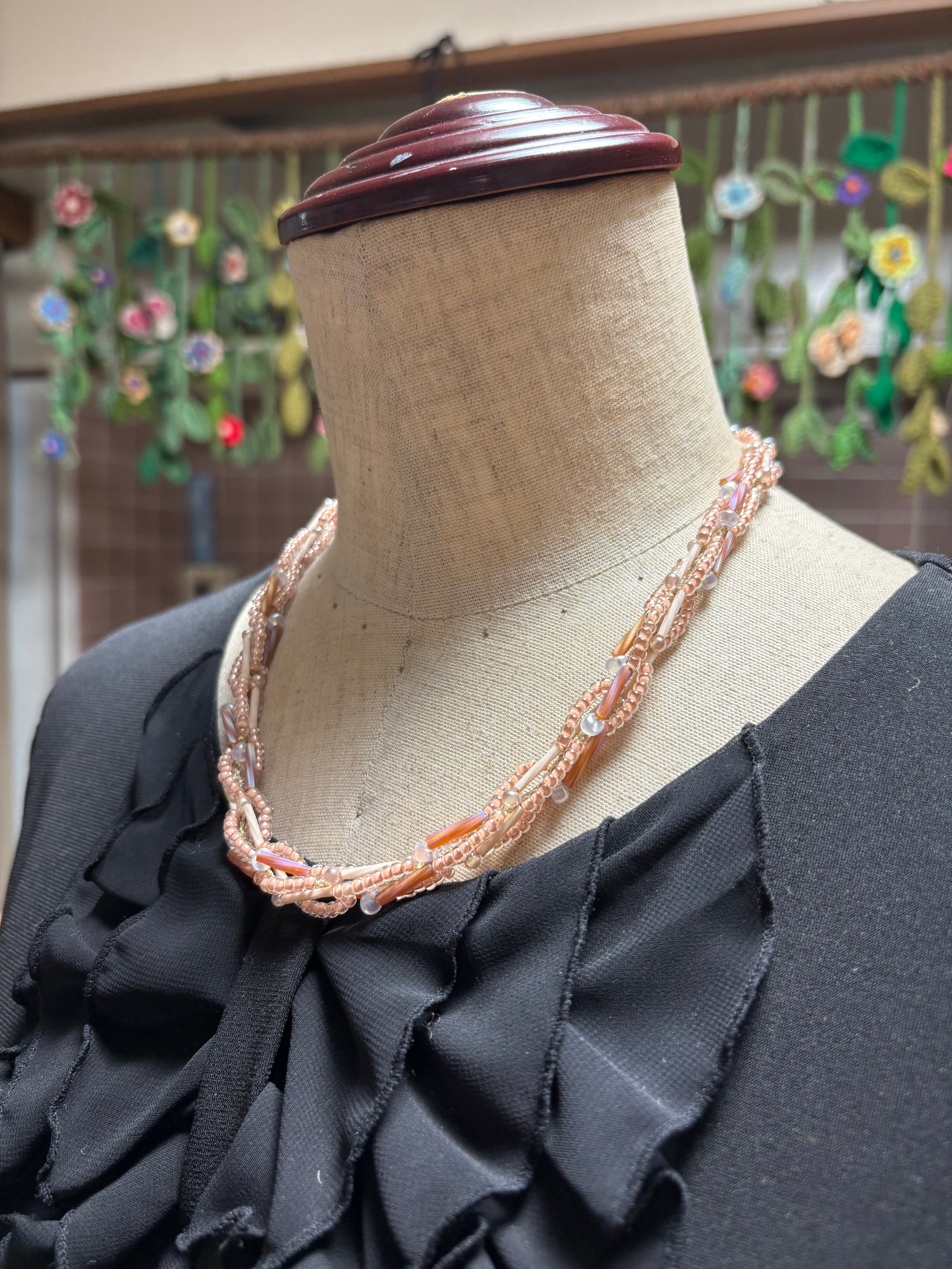 ペレンクロッシェ《HARUIRO》。色とりどりのパステルカラーが揃ったネックレスは、まるで花々が咲いたような華やかさ。手編みの温もりが、心地よい季節を彩ります。