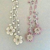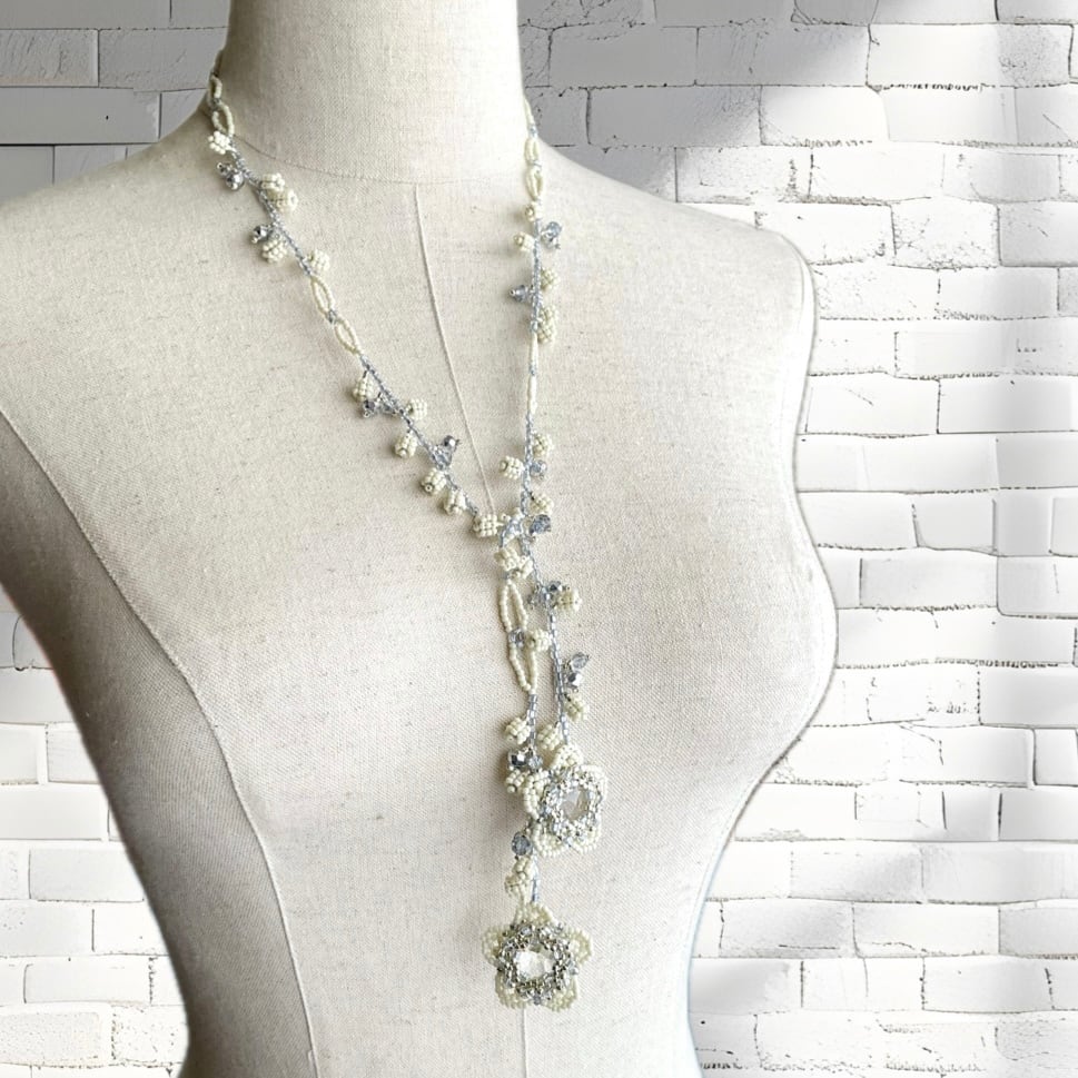 ニットで編んだお花とポンポンをイメージしたラリエットです。お花の中心にはシャンデリアパーツが入っていてキラキラと存在感があります✨ニットの優しくてふんわりとしたイメージを表現した作品です。