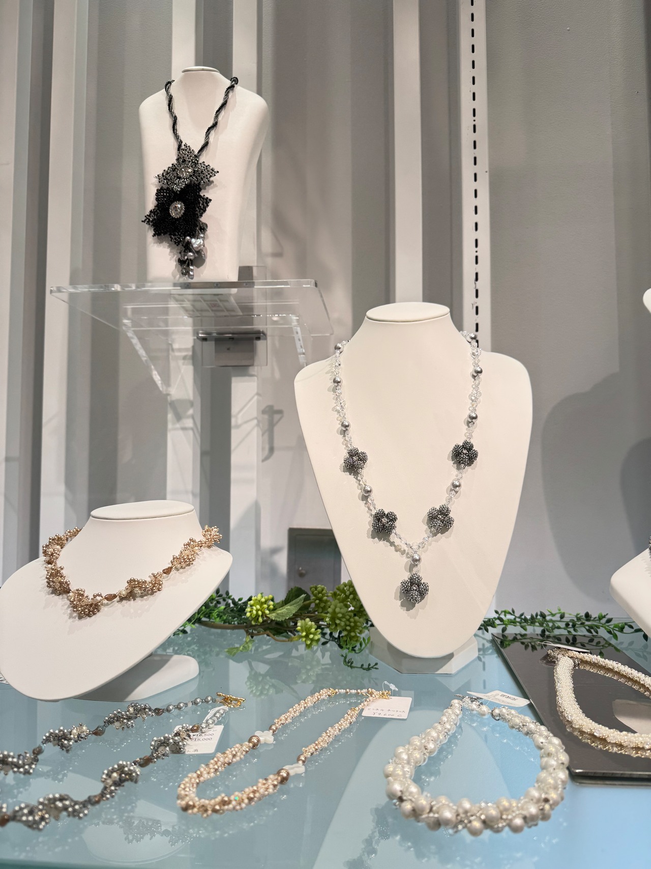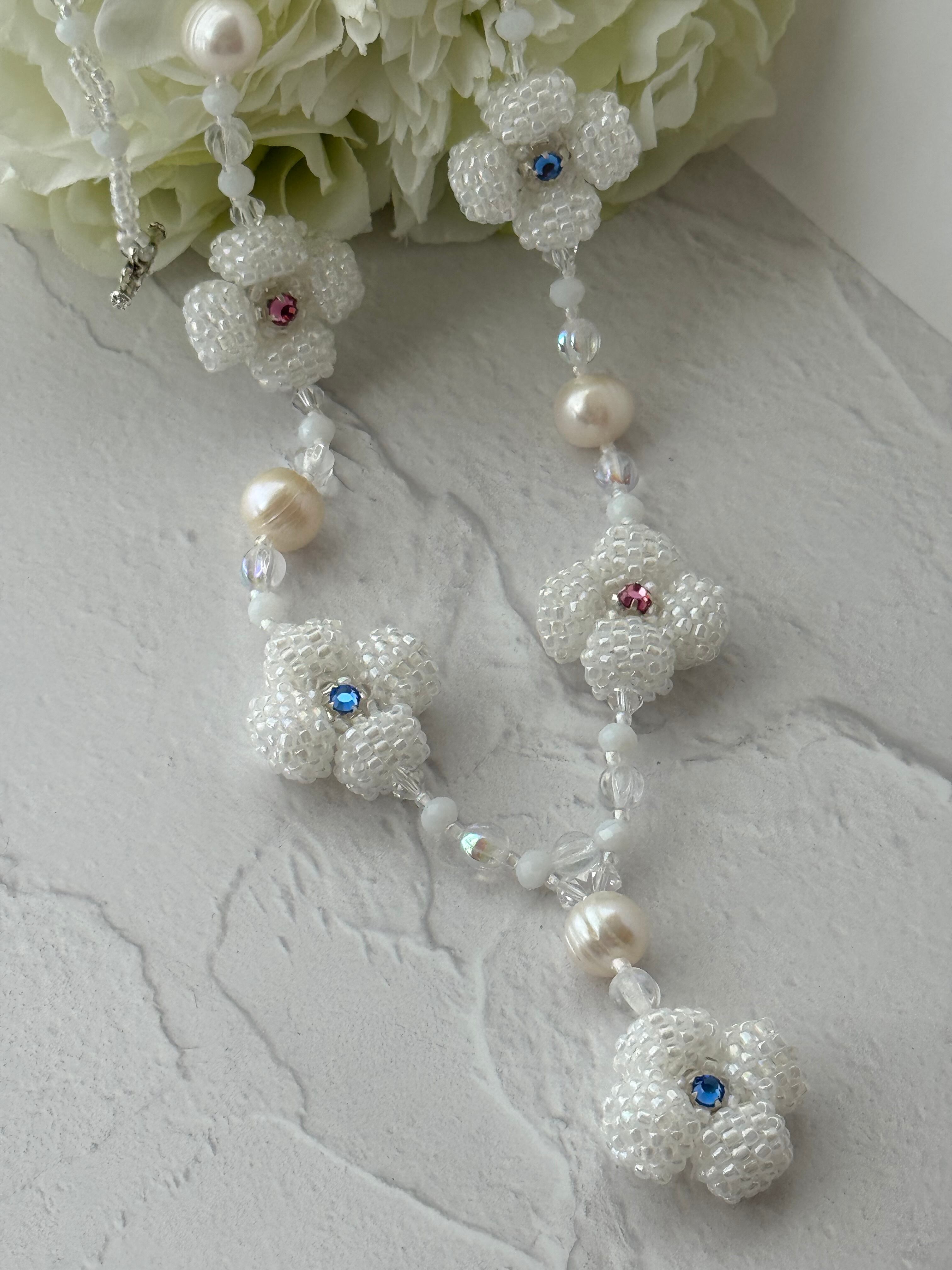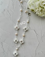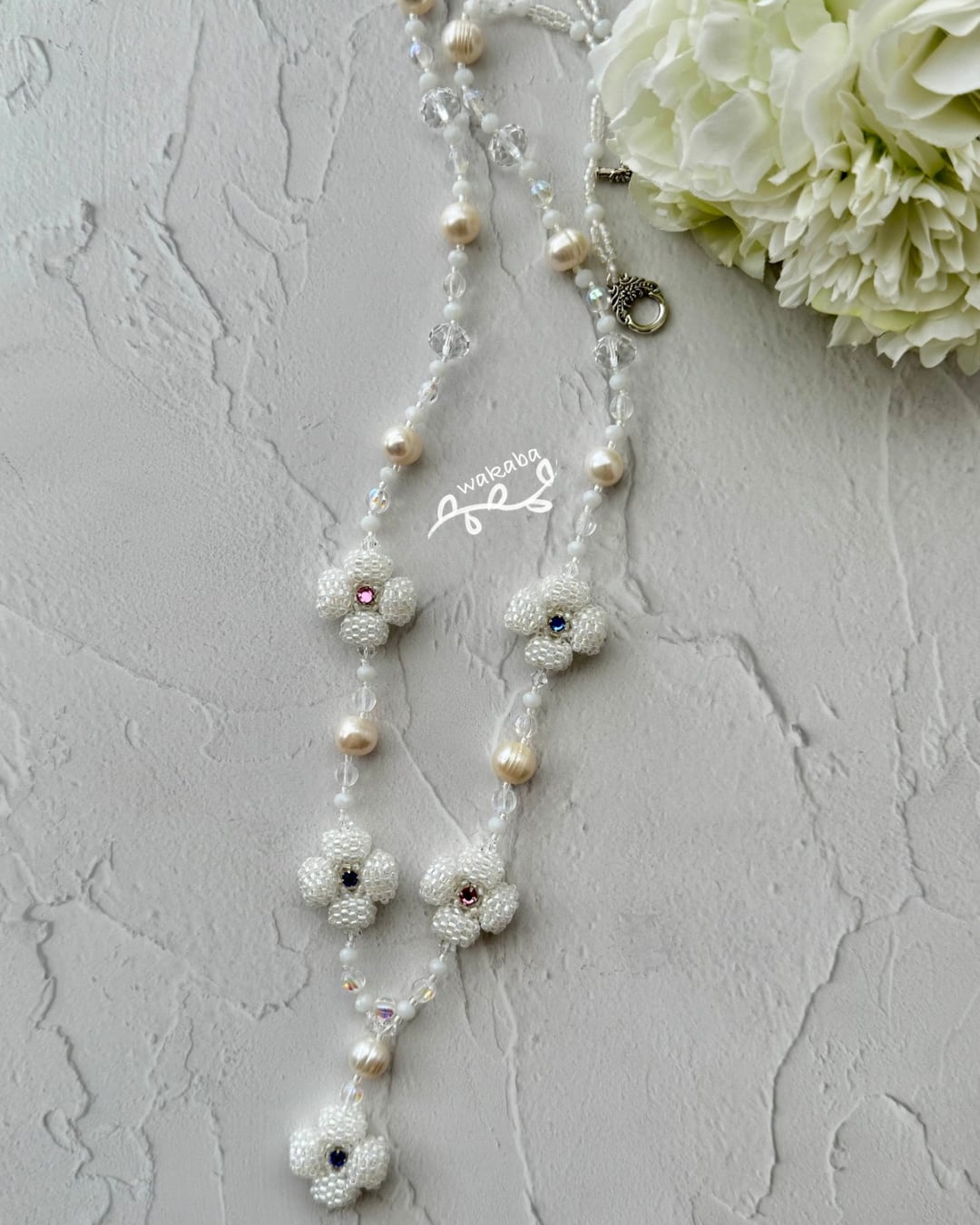 白い花の花芯に、キラキラのクリスタルガラスをあしらったネックレスが楽しめます✨