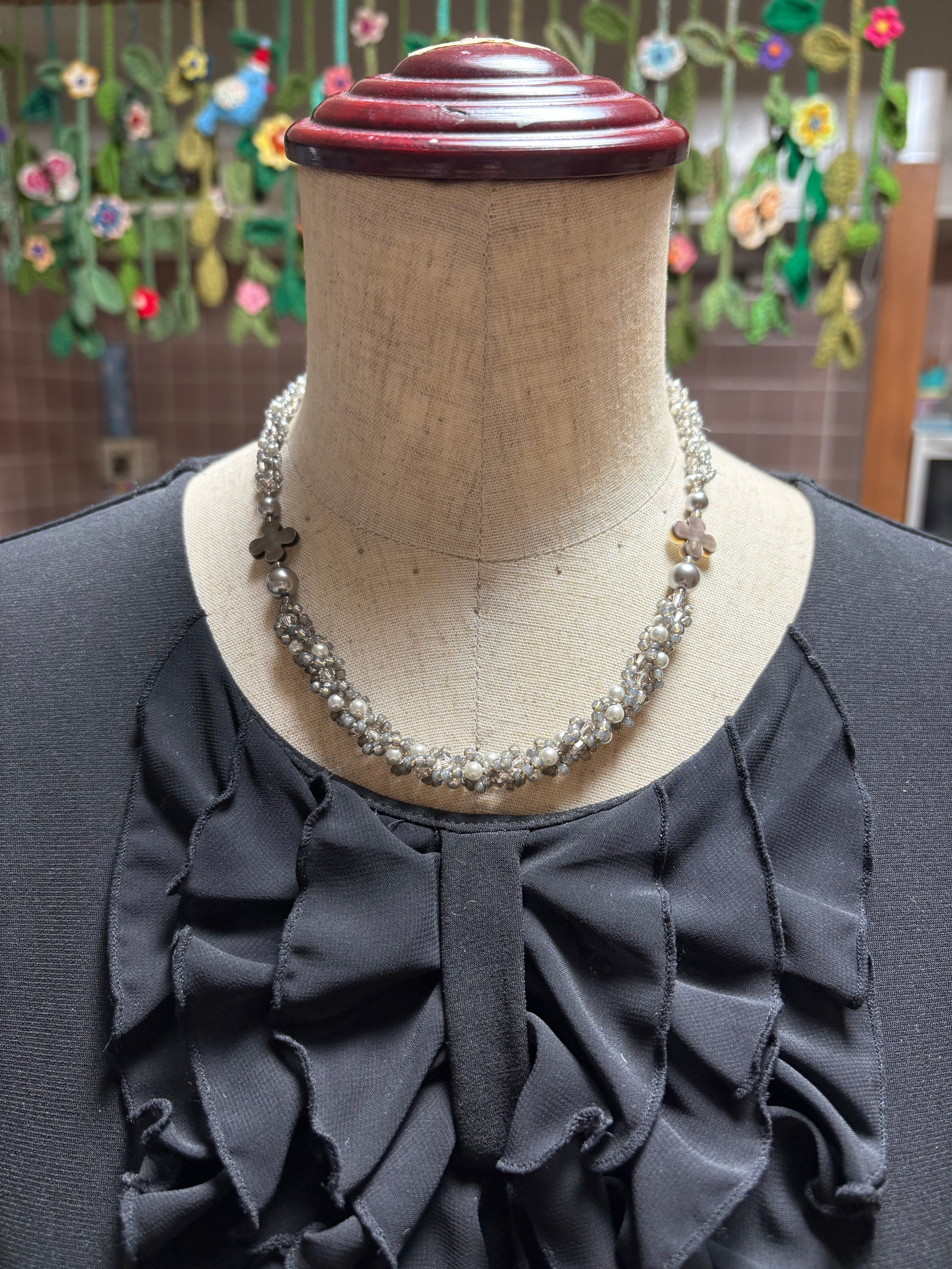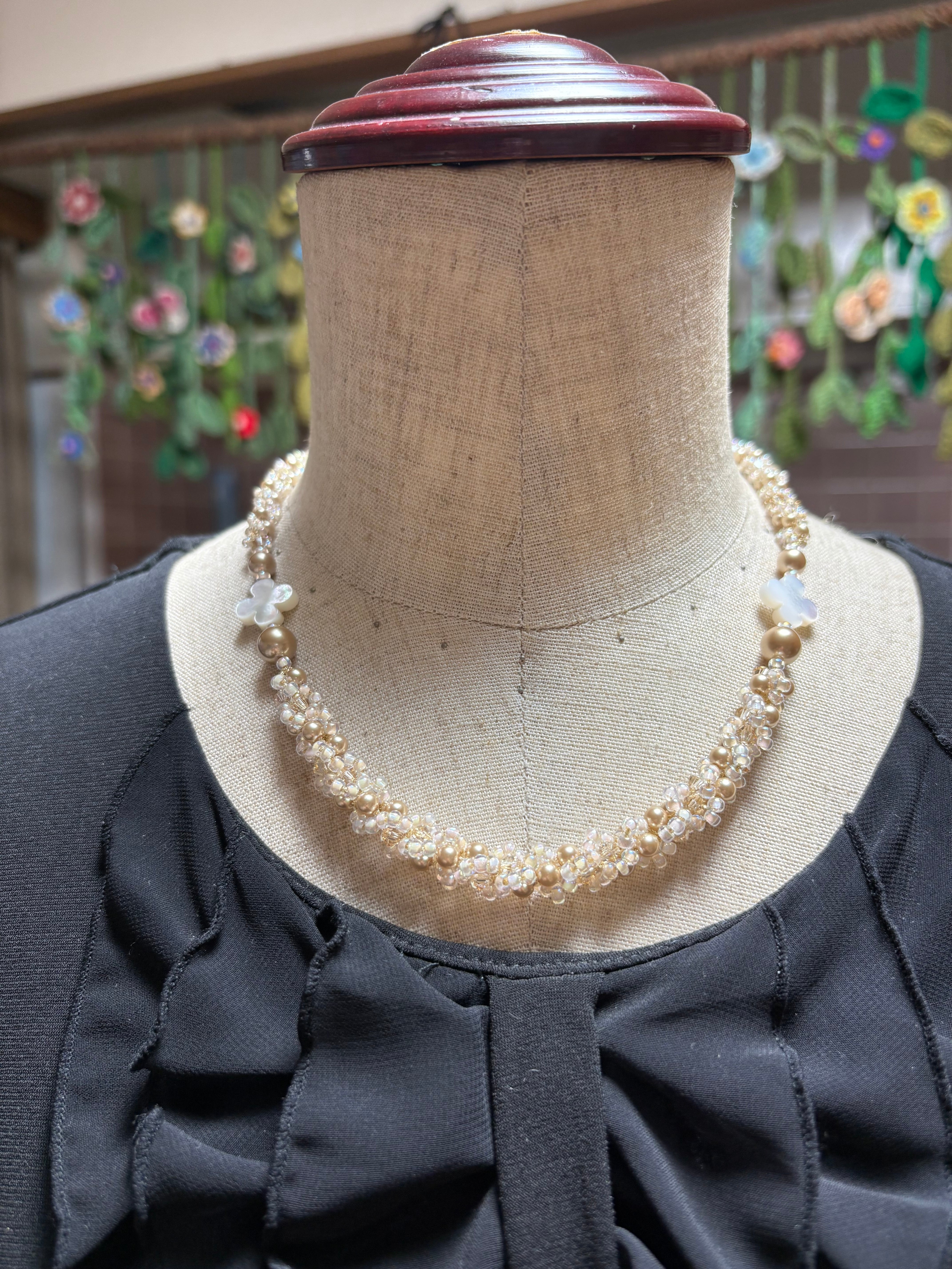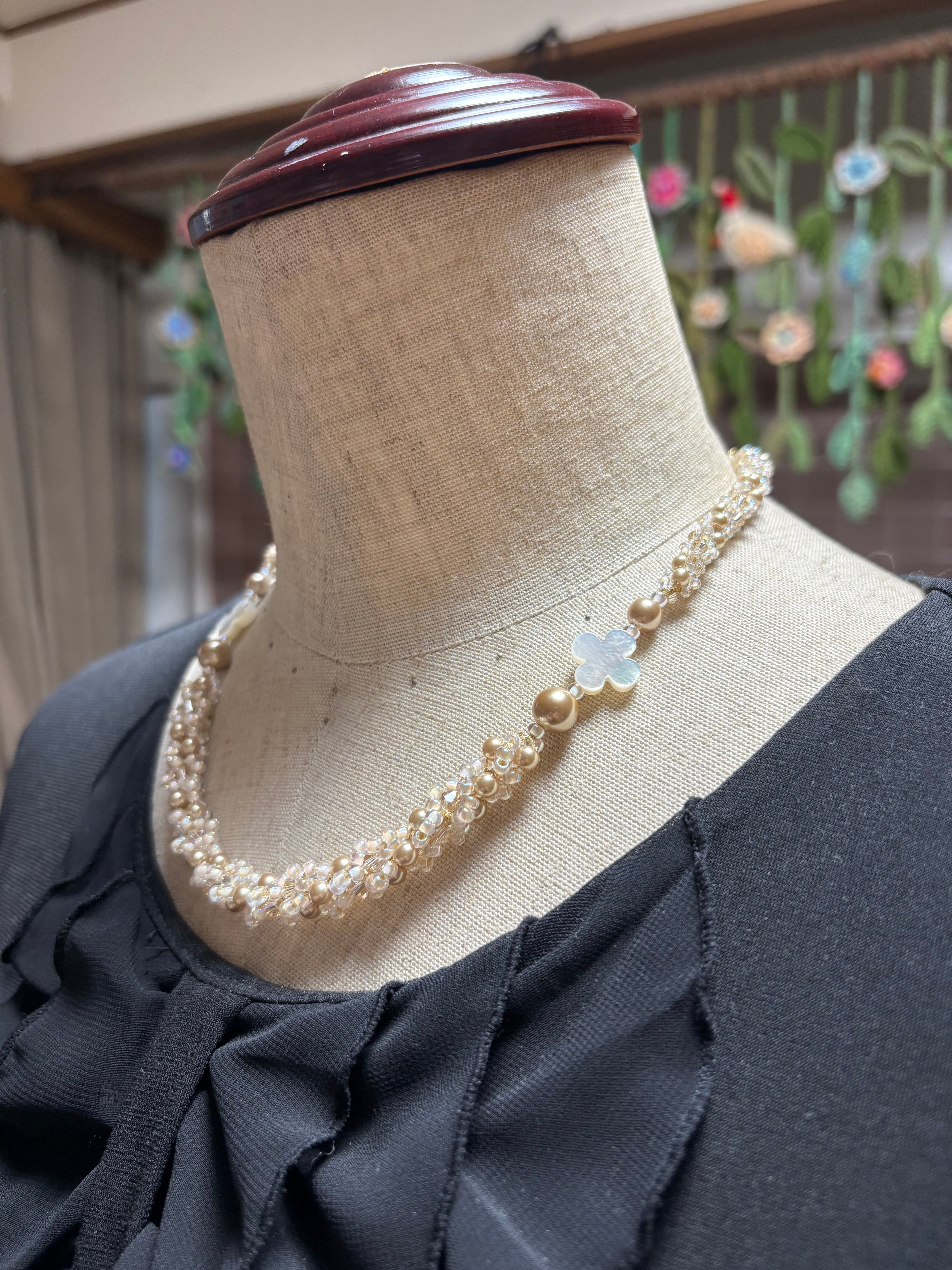 ペレンクロッシェで編む、フラワーシェルを使用したネックレスです。