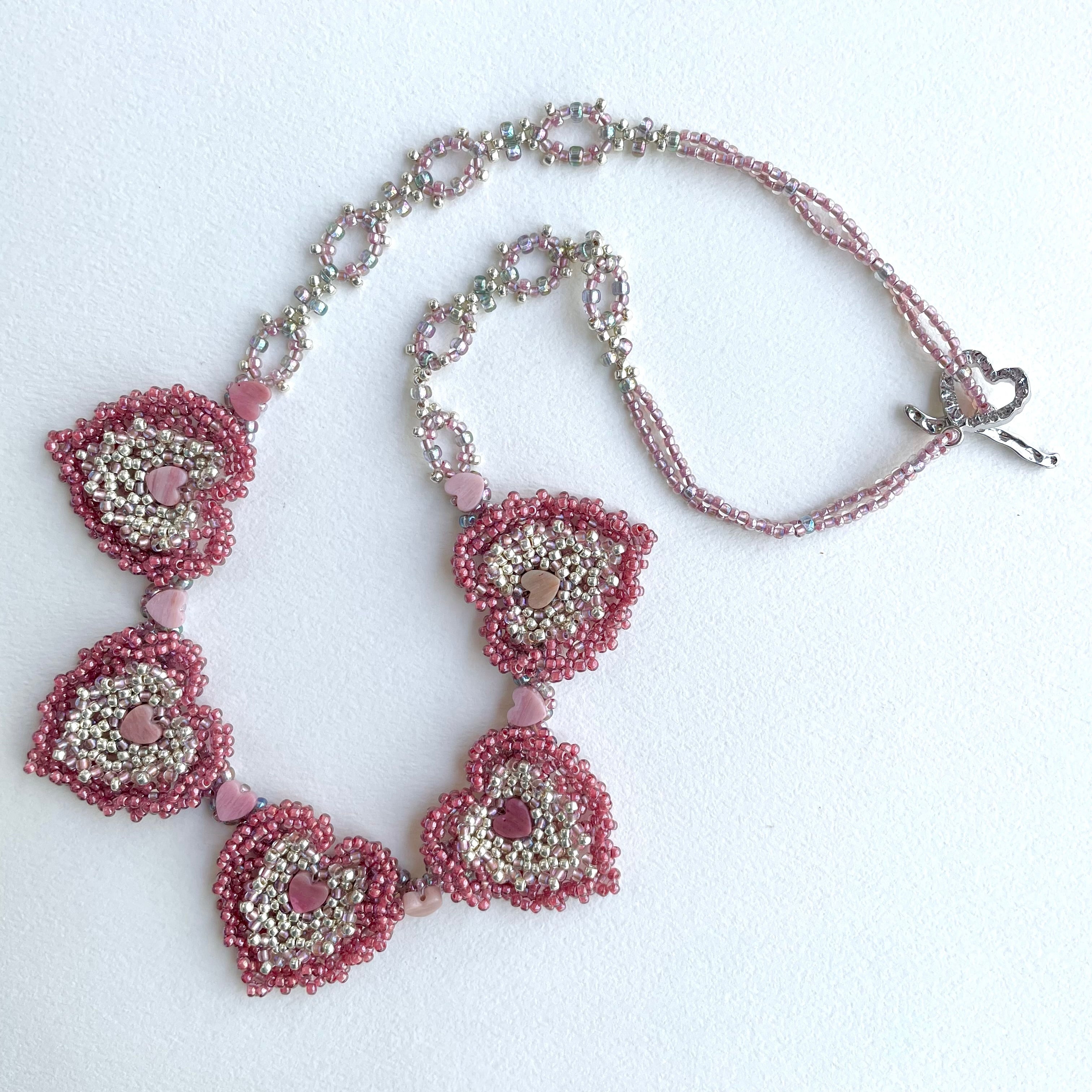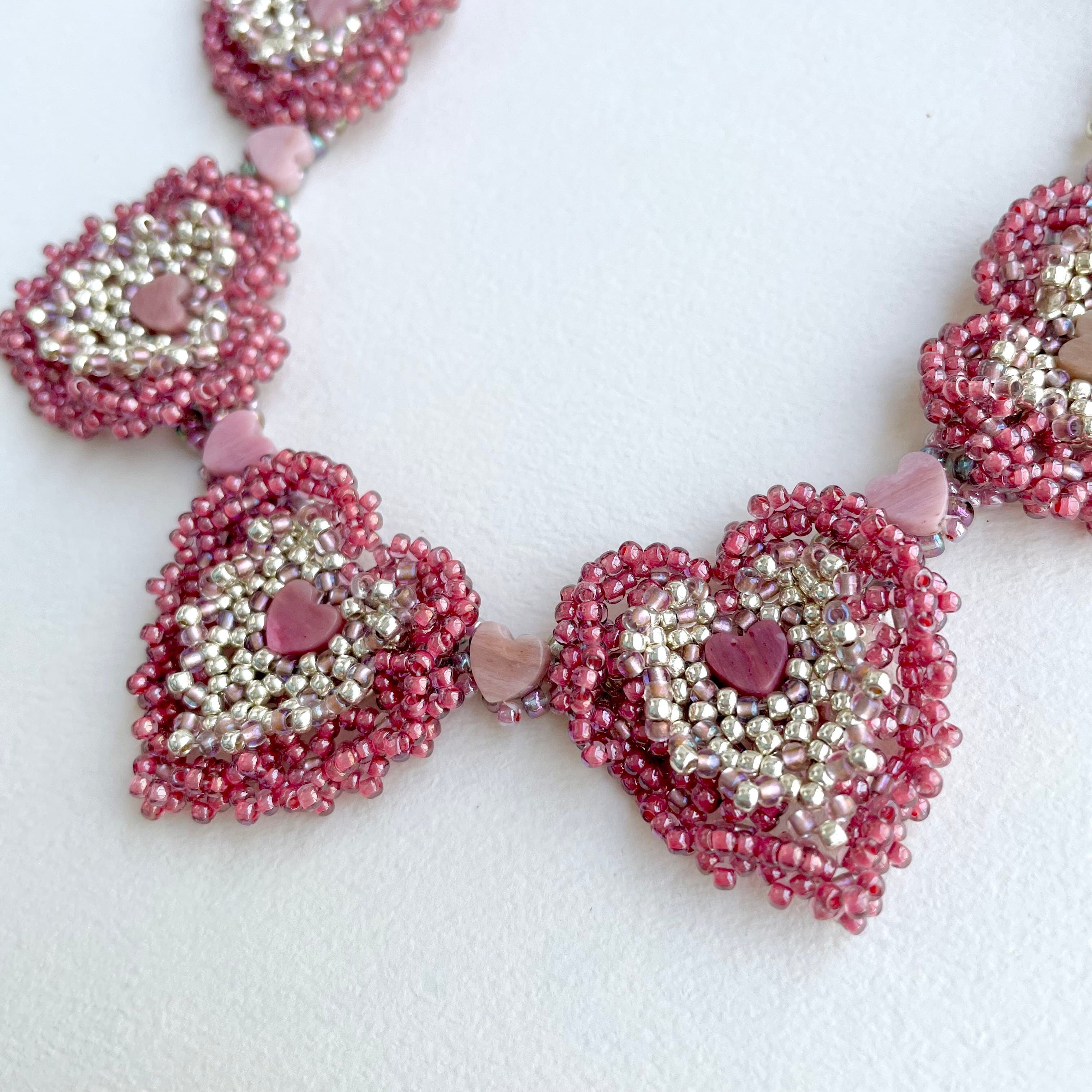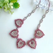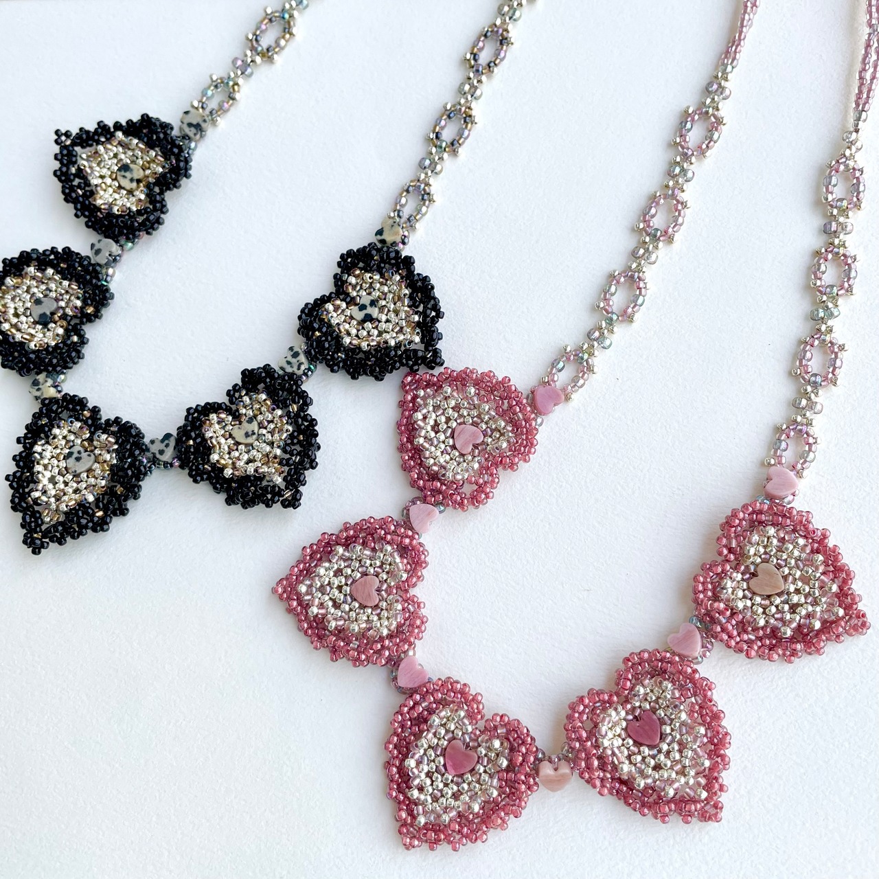 大人が身につけられるハートモチーフをネックレスにしてみました。モチーフの中心にはストロベリーチョコレートのような可愛らしいハートビーズが♡留め具もハートで揃えています。