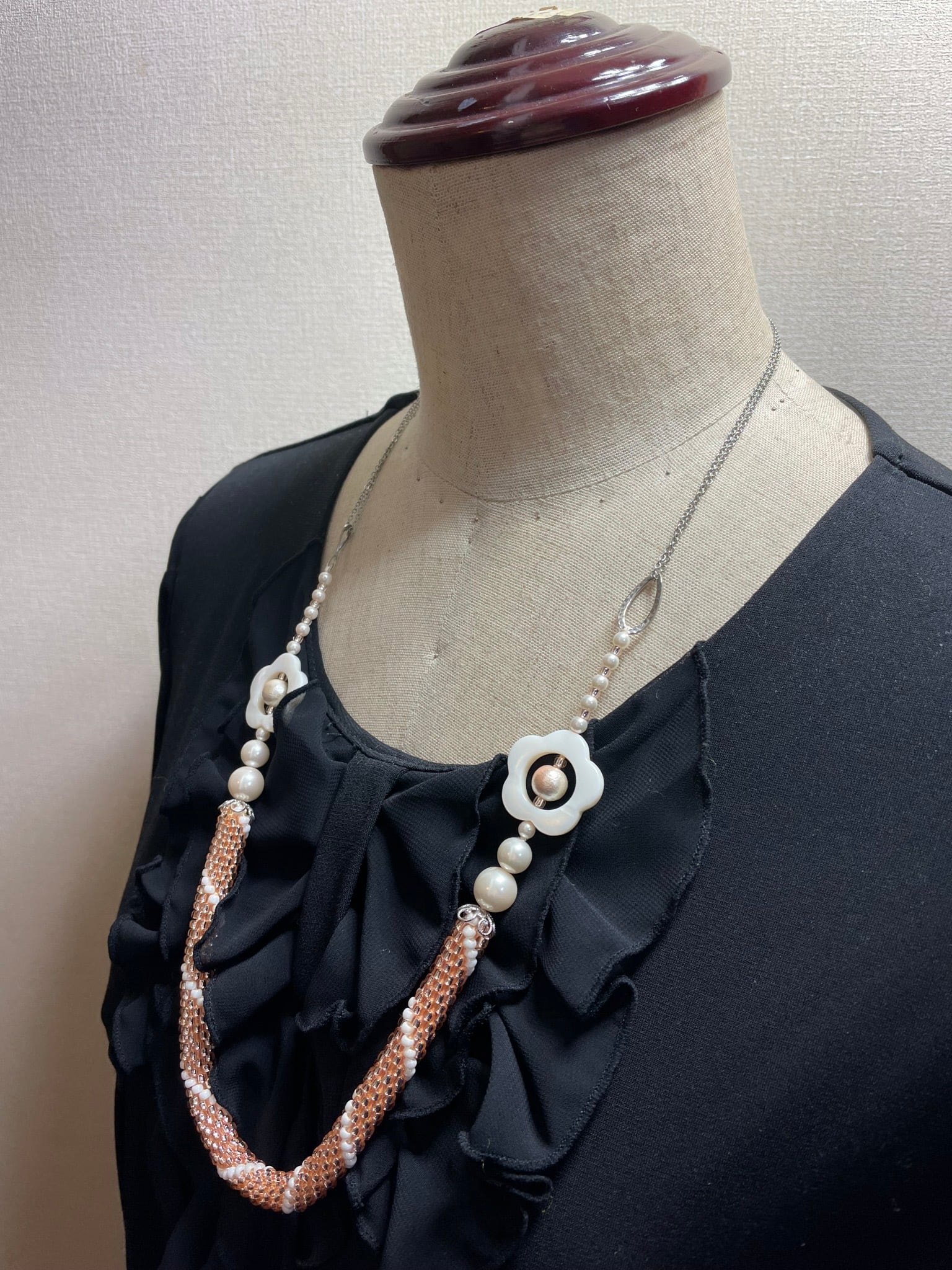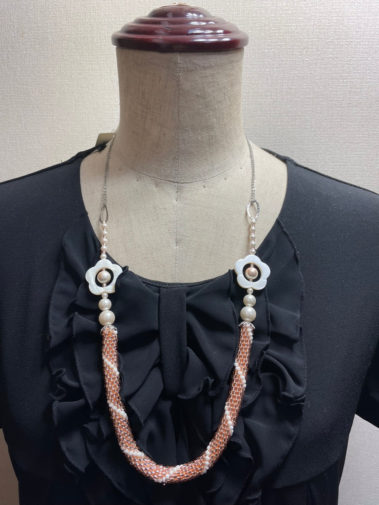 チューブクロッシェで編んだ、お花のシェルが可愛いネックレス。