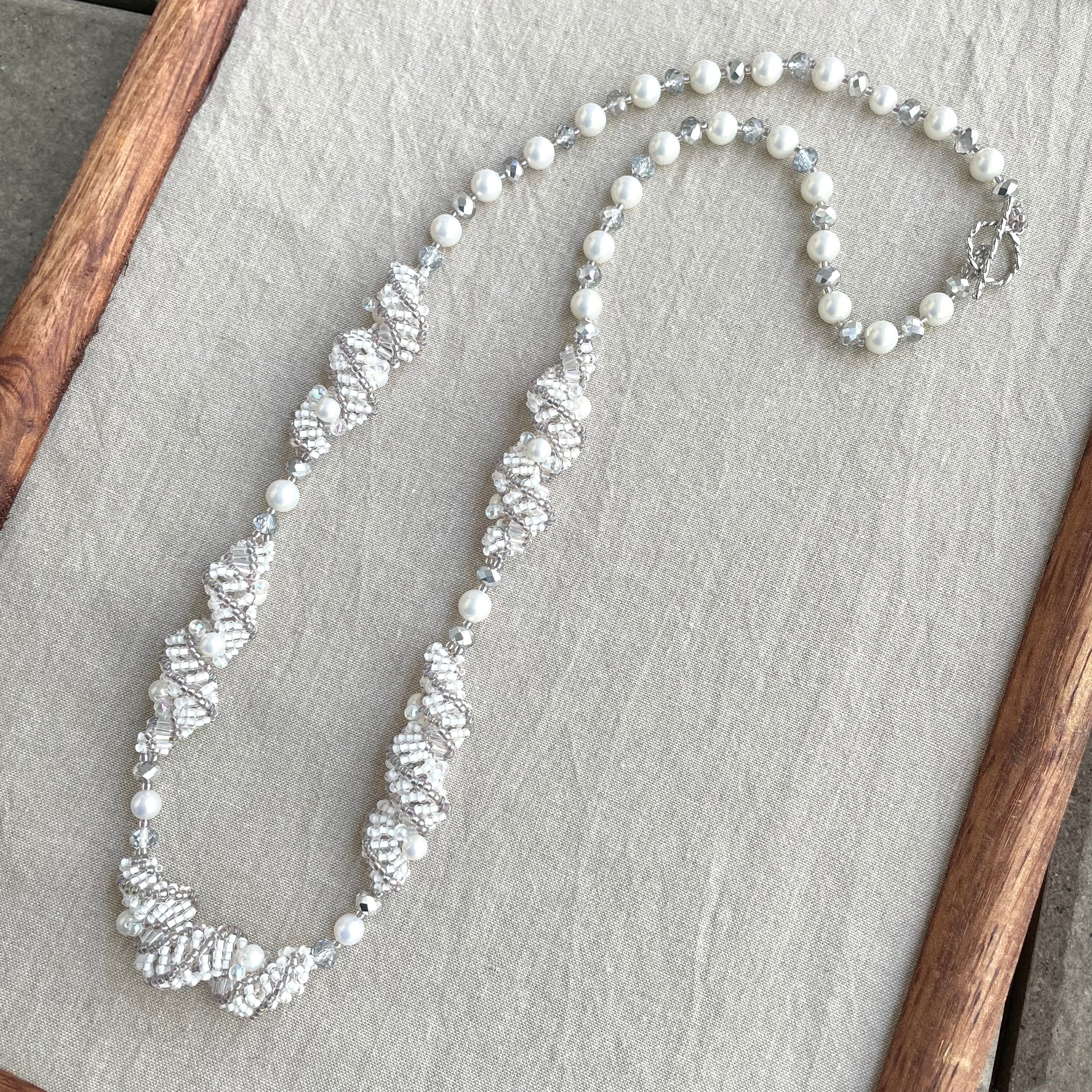 パールを基調としてネッティングのパーツを繋げたミドル丈のネックレス。ボリューム感はありますが、見た目より軽くデイリーにお使いいただけます。