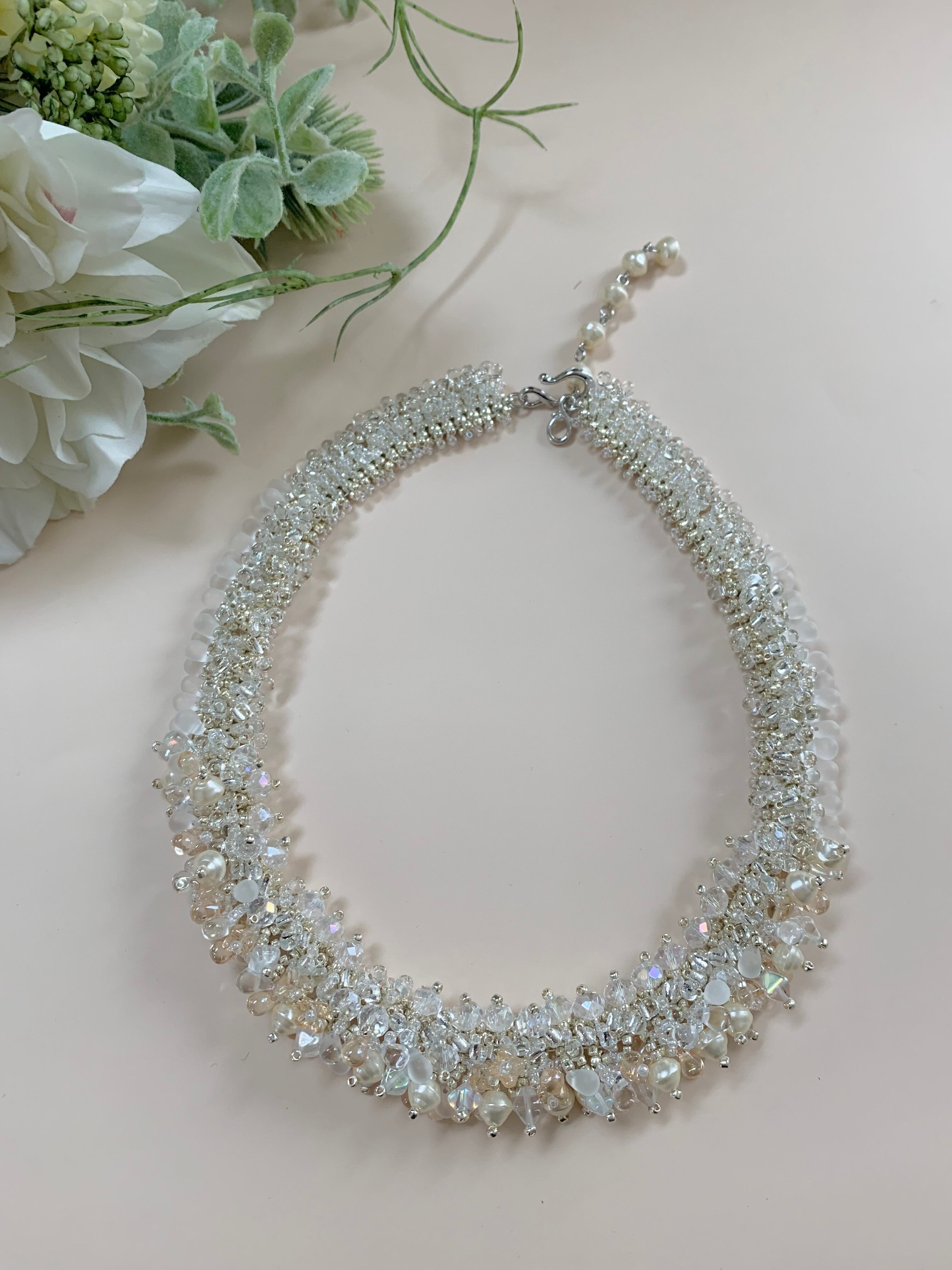 使用ビーズはドロップビーズ数種類、パール、ガラスカットビーズ、フラワービーズ、シードビーズなど