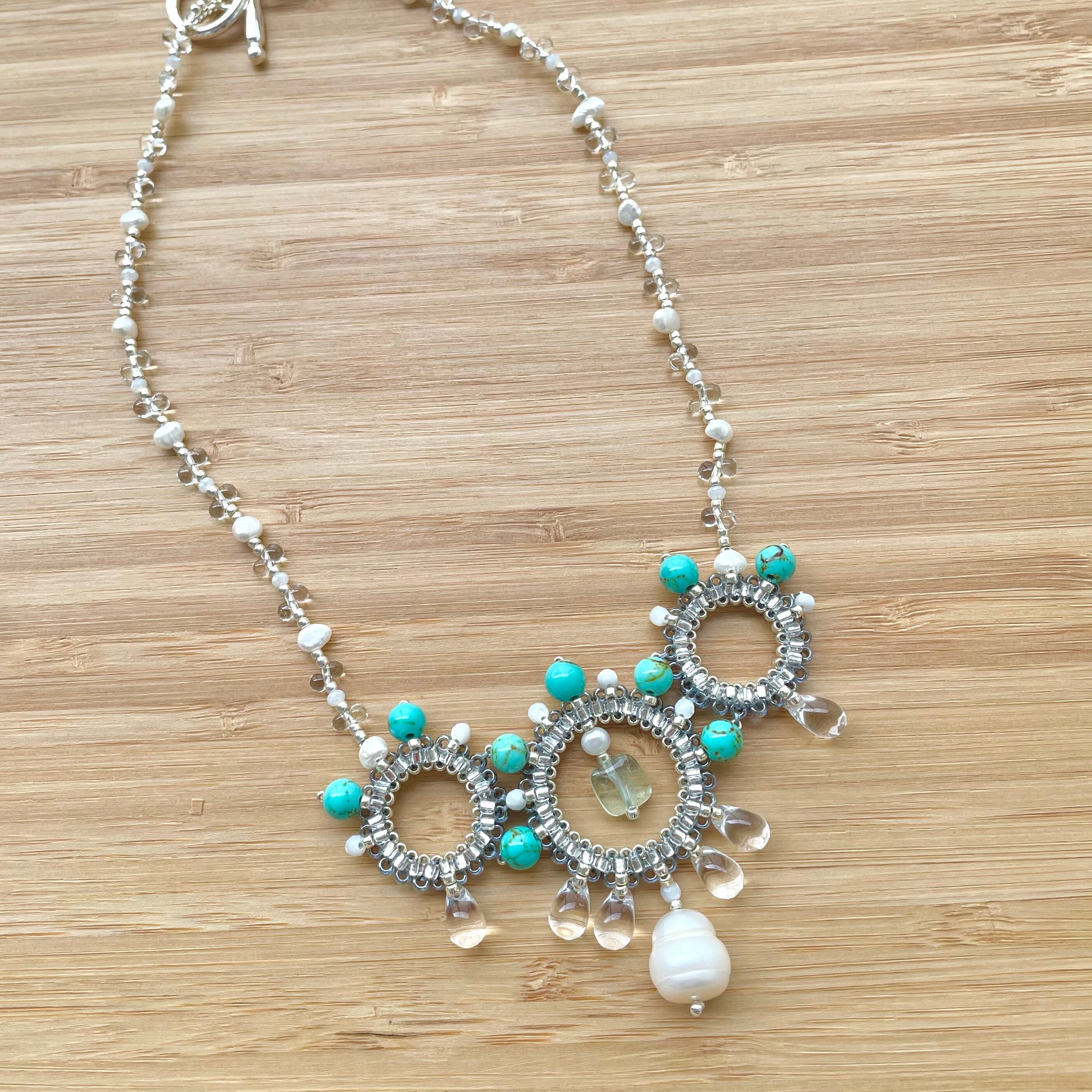 リングパーツを繋げた個性的なデザインのネックレスです。ターコイズと大粒の淡水パールにクリアなガラスビーズを合わせました。