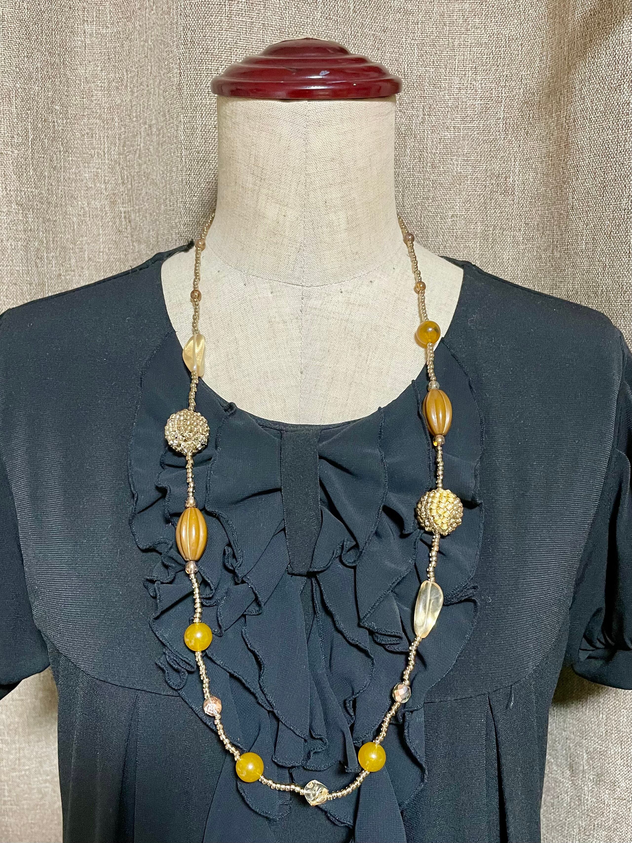 2色のビーズで編むボールのネックレスは、秋冬の装いにぴったり。シンプルなデザインながらも存在感があり、一点でコーディネートが完成します。