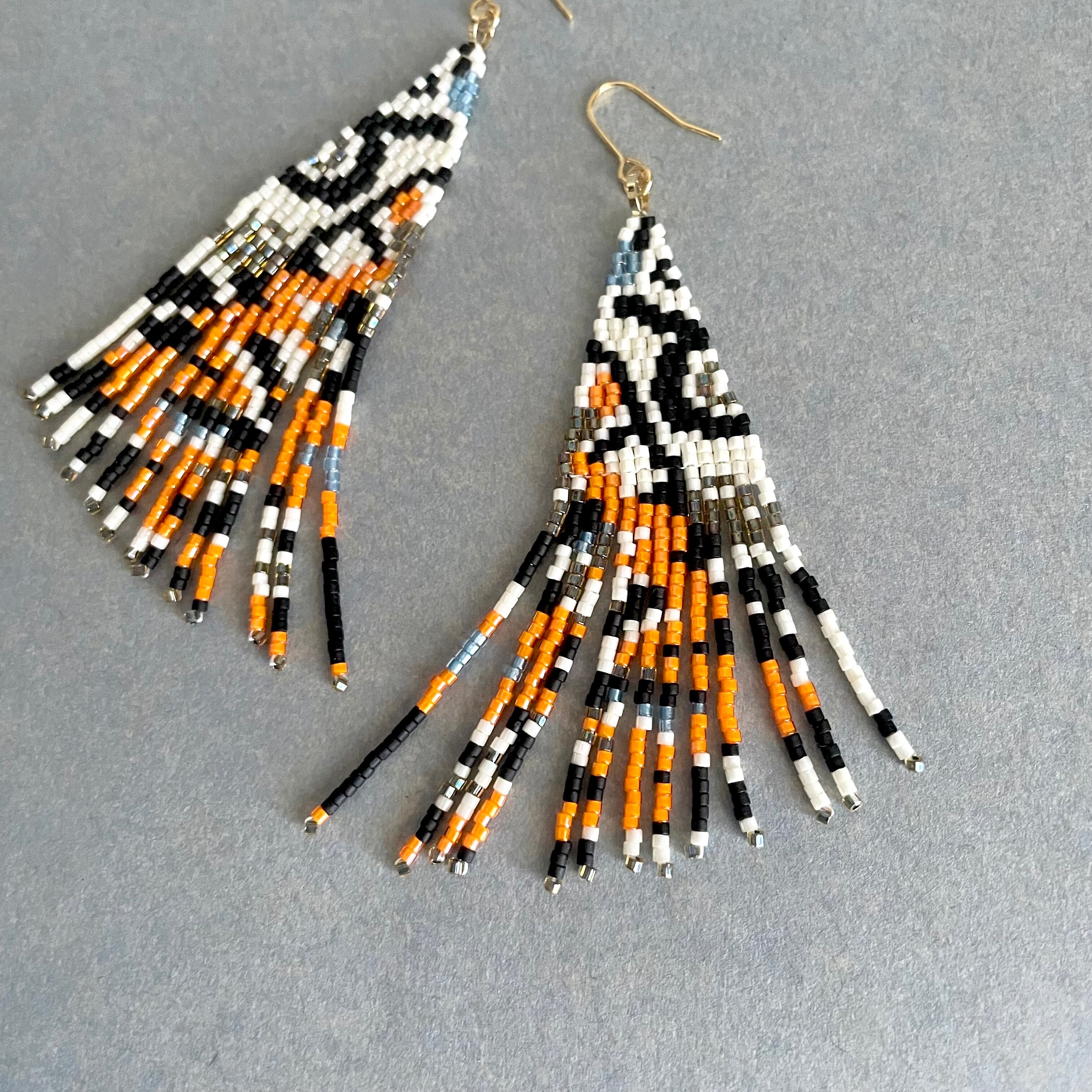 テキスタイルの柄をイメージした個性的なフリンジのピアス/イヤリングです。ピアス・イヤリングの金具は両方とも入っています。お好きな方で仕立ててください。